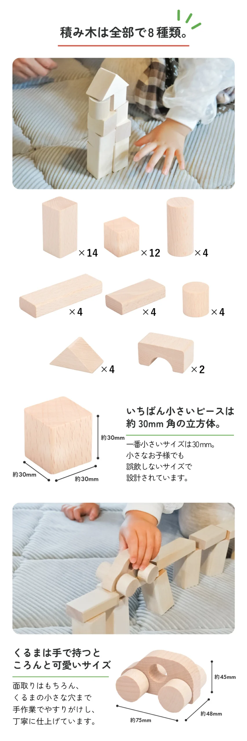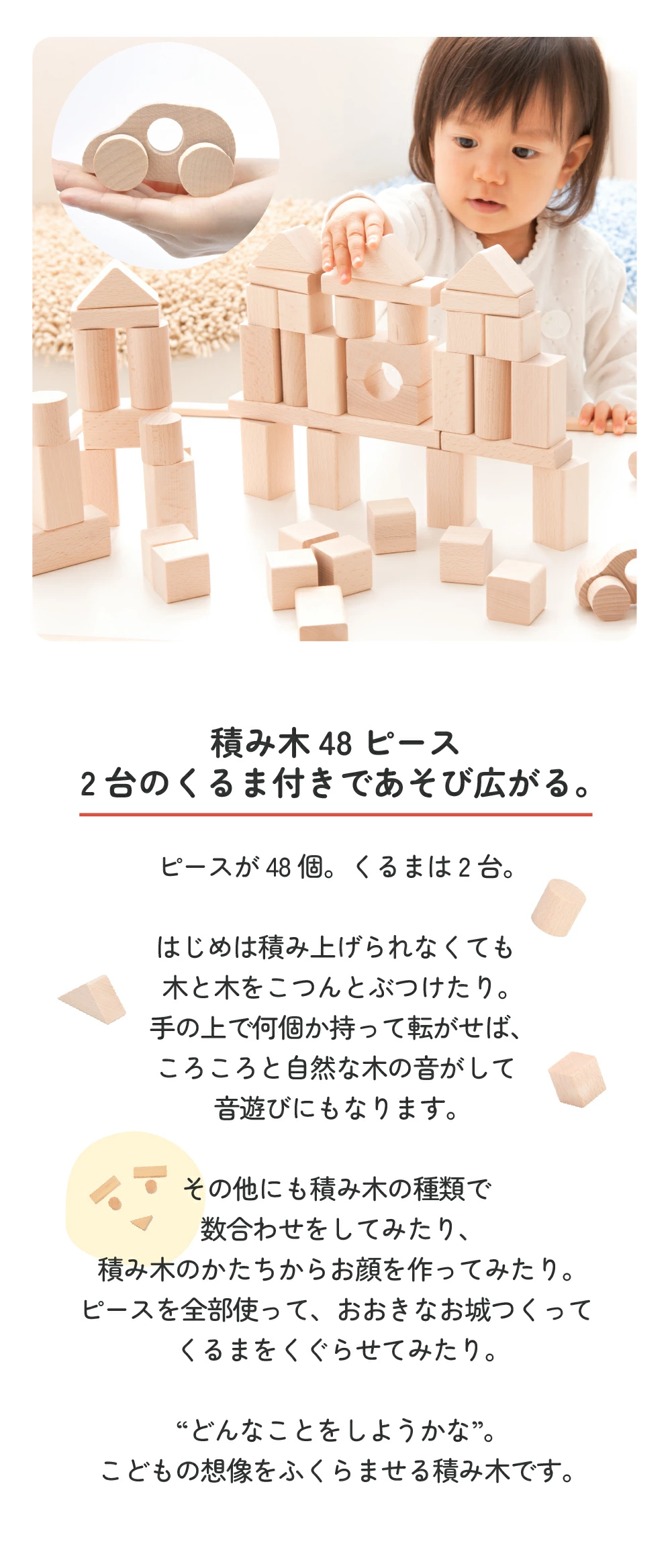 48塊未上色木質積木套裝,包含兩輛車,適合18個月及以上兒童
